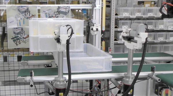 まずは1台ずつ小型無人搬送ロボットで搬送する棚を準備し、運ばれてきた棚から部品をピッキングする作業を検証しました。