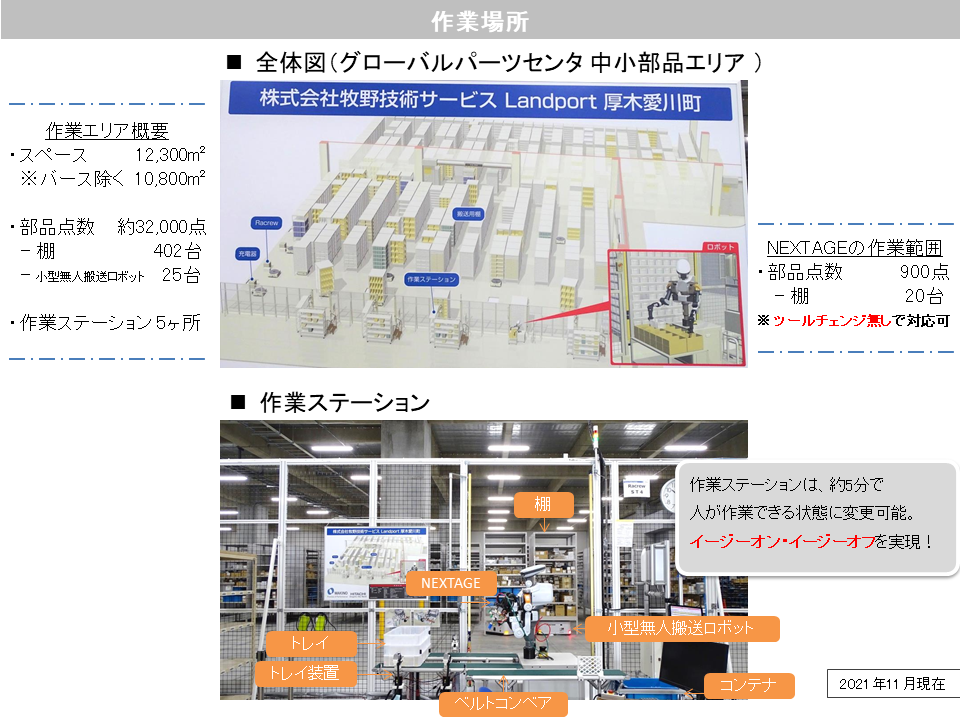 ヒト型ロボット「NEXTAGE」は2018年から計3台ご購入いただき、段階的な検証を経て、現在こちらのグローバルパーツセンタでは1台のNEXTAGEが保守部品セットのピッキングを行っています。